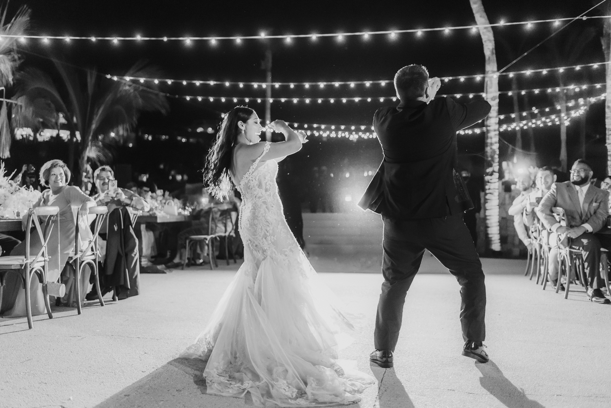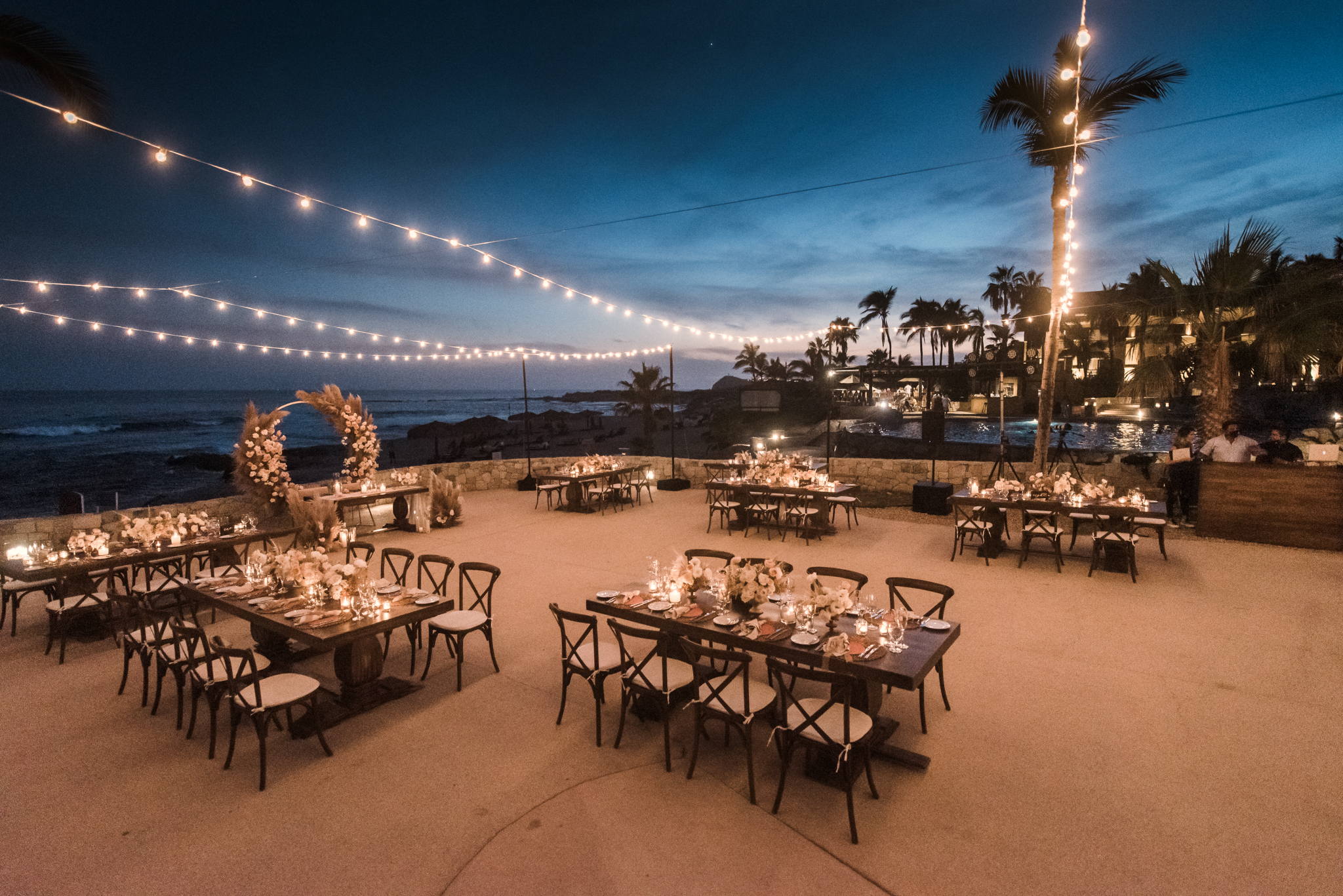 Look at the transformation of the Whale’s Terrace from the ceremony to the wedding reception! The staff at Grand Fiesta Americana Los Cabos Golf Resort and Spa did an amazing job. With the help of Momentos Weddings and Events Los Cabos, they were all able to bring Vivian and Eric’s dream wedding come to life! Neal Urban Weddings was so impressed with how quick and efficient the team was. Neal Urban Photography was able to take advantage of getting reception details before any of the wedding guests came down. We loved all of the string lights and candles to light up the reception. It was a very intimate setting.